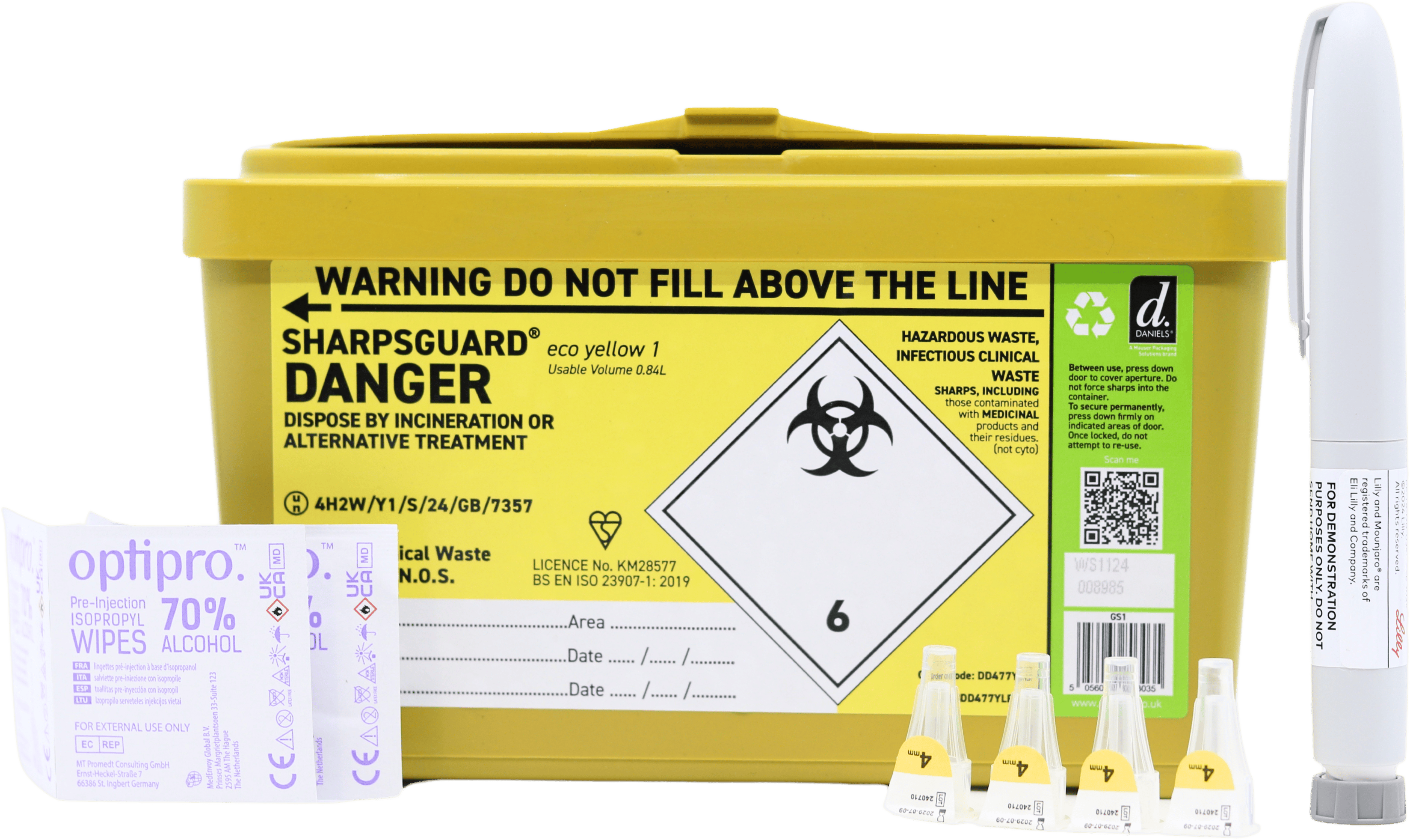 - 1 × Sharps bin for safe disposal of needles